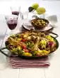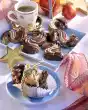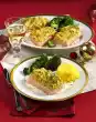 Tie the wings together on the back with kitchen string, tie the legs together with kitchen string. Put them on a fat pan and spread cleaned vegetables around them. Roast in the preheated oven (electric cooker: 175 °C/ convection oven: 150 °C/ gas: level 2) for about 3 3/4 hours. Pour a total of 600-700 ml of water over the vegetables several times. In the meantime clean and wash the Brussels sprouts. Peel 2 onions and dice very finely. Clean and slice the mushrooms. Put the Brussels sprouts in boiling salted water and cook for about 20 minutes. Heat oil in a pan and fry onions until translucent. Remove from the pan and put aside. Add the mushrooms to the frying fat and fry them vigorously while turning. Add onions again. Add truffle butter, melt and deglaze with cream. Stir in crème fraiche, bring to the boil and let it boil down for 5-7 minutes at low heat.
