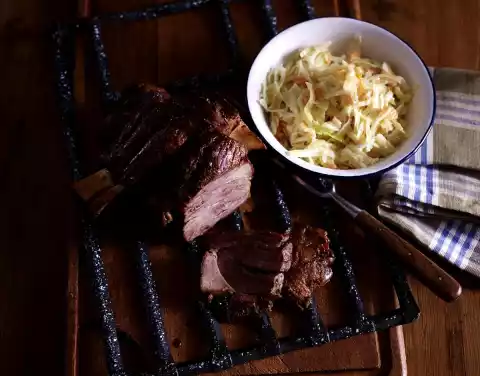 Clean, wash and halve the cabbage and cut out the stalk. Halve the cabbage quarters again and cut into fine strips. Peel, wash and roughly grate the carrots. Peel and finely grate the onion. Mix cabbage, carrots and onion, season with salt, pepper and sugar. Mix sour cream, mayonnaise and vinegar. Season with salt, pepper and sugar. Mix everything evenly into the cabbage. Leave to stand in a cool place for about 1 hour. Take the knuckle of pork out of the oven, season with pepper, let it rest for a short time and cut it into slices from the bone.