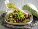 Mix sour cream, mayonnaise and vinegar. Season with salt, pepper and sugar. Mix everything evenly into the cabbage. Leave to stand in a cool place for about 1 hour. Take the knuckle of pork out of the oven, season with pepper, let it rest for a short time and cut it into slices from the bone. Season cabbage salad again with salt, pepper and sugar. Garnish with parsley