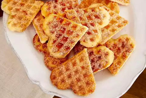 Mix sugar and cinnamon. Heat up a waffle iron and spread with oil. Put 3-4 tbsp. of dough in the middle of each wafer, spread lightly and bake about 12 golden yellow wafers one after the other. Divide immediately into hearts and turn in the cinnamon sugar. Serve with caramel sauce or cherry compote.