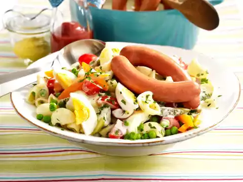 Season again. Wash the tomatoes, grate dry and cut into quarters. Fold into the salad. Put the lettuce in a bowl. Wash parsley, pluck leaves from the stalks and chop. Sprinkle over the lettuce. Heat the sausages and serve with the pasta salad. Serve with mustard and ketchup