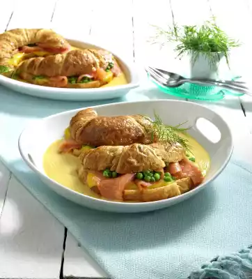 Cut the croissants, but do not cut through. Cut remaining cheese slices diagonally in half. Cover the croissants with 2 cheese wedges and 1 slice of salmon. Sprinkle with peas. Spread the sauce in casseroles (1 large or 2 smaller ones) and place the croissants inside. Bake in the preheated oven (electric cooker: 200 °C/ convection oven: 175 °C/ gas: level 3) for 8-10 minutes. Garnish with dill