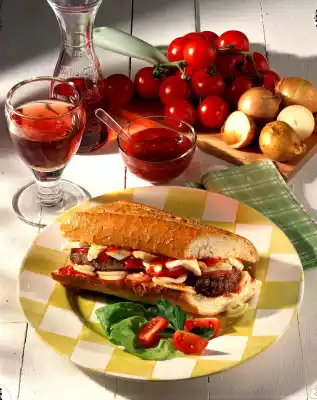 Heat the oil in a pan. Shape the minced meat into about 2 flat meatballs and fry on both sides over medium heat for 6-8 minutes. In the meantime, cut the baguette open lengthwise and spread the inner surfaces with tomato and chilli sauce.