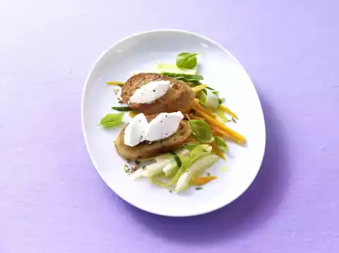 Stir the goat's cheese and milk until smooth, use two teaspoons to cut off the cams and place them on the slices of bread. Arrange vegetables and bread slices on plates, garnish with basil and pepper if necessary