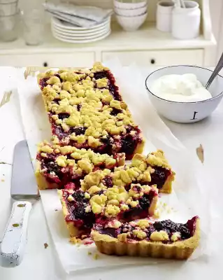 Cut out baking paper to form a rectangle (approx. 12 x 36 cm) and place on the pastry base. Add the dried peas and bake in a preheated oven (electric cooker: 175 °C/ convection oven: 150 °C/ gas: see manufacturer) for 10-15 minutes without cover. Remove the base, remove baking paper and dry peas. Spread the blackberry mixture and remaining crumbles on the base and bake at the same temperature for approx. 35 minutes. Remove and leave to cool on a cake rack for approx. 6 hours (preferably overnight). Whipped cream tastes good with it