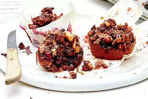Grease a muffin baking tray (twelve troughs) and line with baking paper (see tip). Preheat the oven (electric cooker: 200 °C/circulating air: 175 °C/gas: see manufacturer). Chop chocolate for the dough.
