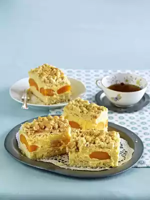 Let the yeast base cool down after baking. Cut the yeast base to the size of the cake frame (30 x 37 cm) and cut in half horizontally. Place the cake base in the frame and spread with 1/3 of the cream. Spread the apricots on top and press down gently. Spread the rest of the cream on the apricots and place the top cake layer on top. Chill for about 3 hours.