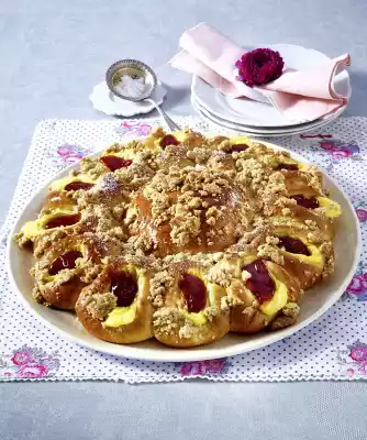 Pour the pudding into a piping bag with a medium perforated spout. Press depressions into the small balls with one finger. Pour the pudding into the depressions. Whisk egg yolk and 2 tbsp. milk. Spread the yeast dough, spread crumbles on top and bake in a preheated oven, 2nd flush.