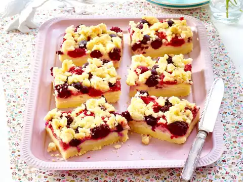 Spread the berries on the pudding and crumble the rest of the crumbles over it. Bake in a preheated oven (electric cooker: 175 °C/ convection oven: 150 °C/ gas: see manufacturer) for approx. 50 minutes, remove from oven and let cool on a cake rack.