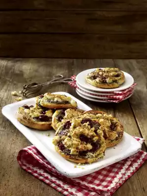 Cut the roll into about 14 thick slices. Press the snails a little flatter and spread them on 2 baking trays lined with baking paper. Spread crumbles on the snails. Bake the trays one after the other in a preheated oven (electric cooker: 200°C/ convection oven: 175°C/ gas: level 3) for 15-20 minutes.