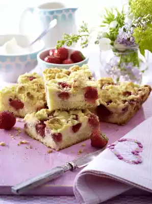 For the sponge mixture, mix 250 g soft butter, 250 g sugar and 1 pinch of salt until creamy. Stir in 4 eggs one after the other. Mix 400 g flour and baking powder, stir in briefly. Grease the fat pan of the oven (32 x 39 cm) and dust with flour. Add the sponge mixture and smooth it down. Spread strawberries on the dough. Spread the cheese mixture on top and smooth it down. Add crumbles. Bake in the preheated oven (electric cooker: 200 °C/ convection oven: 175 °C/ gas: level 3) on the 2nd rack from below for approx. 40 minutes. After 30 minutes continue baking on the middle shelf. Remove from oven and let cool on a cake rack. Whipped cream tastes good with it