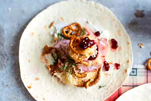 Coat wraps with sour cream and mustard. Fill, fold and fry with prepared ingredients, sauerkraut, smoked pork, salted pretzels, Obatzda and cranberries.