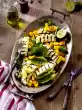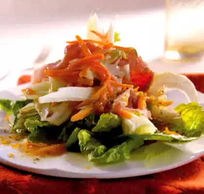 Slice or cut the fennel into thin slices. Clean the salad, wash and spin dry. Put some larger leaves aside, cut the rest into wide strips.