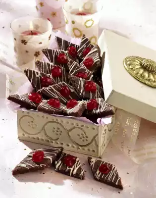 In the meantime, roughly chop the chocolate coating and melt it in a hot water bath. Halve the cherries. Put the couverture in a freezer bag and cut off a small corner. Spray chocolate stripes over the rhombs and decorate with beaten cherries. Let it dry. Results in about 58 lozenges