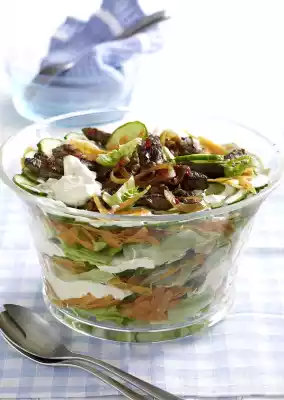 After 3 minutes add onion rings. Season to taste with salt and Sambal-Oelek. Place the salad ingredients alternately in a high salad bowl.