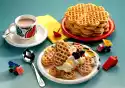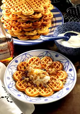 To garnish, mix yoghurt, quark, lemon juice and 1 tablespoon maple syrup. Serve the waffles with the quark, remaining muesli and maple syrup. Makes about 12 pieces.