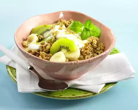 Peel and slice the kiwi and banana. Fill muesli, yoghurt, honey and prepared fruit alternately into a bowl. Decorate with mint.