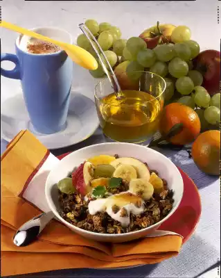 Take out and let it cool down. Stir curd, milk and 50 g honey until smooth. Wash the apple, cut into eighths and remove the core. Wash and pluck the grapes, cut them in half and remove the seeds. Peel clementine, cut into slices and quarter.