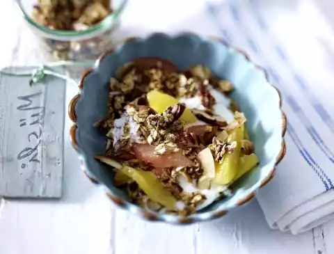 Roughly chop the seeds. Mix flakes, seeds, linseeds, coconut chips and honey. Spread on a baking tray lined with baking paper. Roast in a preheated oven (electric cooker: 175 °C/ circulating air: 150 °C/ gas: level 2) for 10-15 minutes. Put the finished muesli in a cool place and pack it airtight
