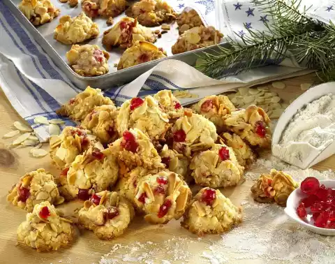 Carefully fold in flaked almonds, chopped almonds and cherries. Place 1 teaspoon of dough in heaps on each of 2 baking trays lined with baking paper. Bake the trays one after the other in a preheated oven (electric cooker: 200 °C/ convection oven: 175 °C/ gas: level 3) for about 10 minutes. Let the cookies cool down a little on the hot baking tray, then lift them carefully off the baking tray and let them cool down on a cake rack