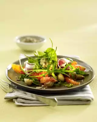 Clean and halve the mushrooms. Heat 2 tablespoons of oil in a frying pan, add the mushrooms and fry them for 3-4 minutes while turning them, remove them and season with salt and pepper. Carefully mix salad, mushrooms, orange fillets and vinaigrette and arrange on plates.