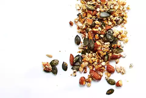 Chop the almond kernels coarsely and put them in a bowl with coconut flakes, ground almonds, buckwheat, sunflower and pumpkin seeds. Add honey, egg white and 5 tablespoons of water and mix everything well.