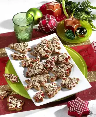 Roll out the dough on a floured work surface (approx. 0.5 cm thick). Cut out fir trees of different sizes and place them on 3 baking trays lined with baking paper. Bake one after the other in a preheated oven (electric cooker: 175 °C/ convection oven: 150 °C/ gas: level 2) for about 11 minutes. Remove from the oven, place on a rack and allow to cool. Spread the cookies thinly with slightly warmed jelly. Sprinkle with the roasted hazelnut leaves and dust with icing sugar