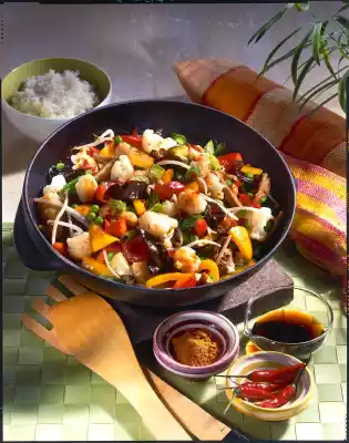 Bring to the boil. Mix the starch with 2 tablespoons of water until smooth and stir into the wok. Add the meat and heat it up. Season with salt and cayenne pepper. Serve rice separately.