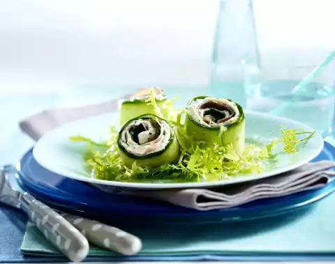 Use the rest for other purposes. Cover each cucumber slices with 1 slice of Parma ham, spread with cream cheese and roll up. Marinate the salad with the vinaigrette and arrange on plates with the cucumber rolls.
