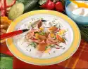 Whisk vinegar, salt, pepper and shallot. Beat the oil into the mixture drop by drop. Wash the cucumber, grate dry and cut in half lengthwise. With a peeler, cut 3 wide slices lengthwise from the middle.