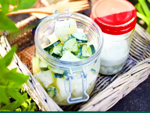 Halve the melon, remove the seeds and cut the fruit halves into slices. Cut the flesh from the skin and dice. Wash and dice the cucumbers. Mix prepared ingredients and season again.