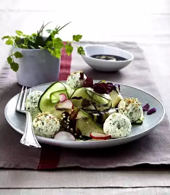 Arrange cucumber radish salad with cream cheese balls on plates, drizzle with sauce. Cut cress from the bed. Sprinkle with sesame and cress