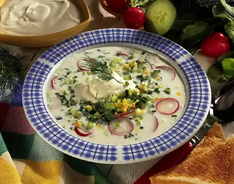 Hard boil the egg in about 10 minutes. Wash the cucumber and cut into small cubes. Clean, wash and slice the radishes. Wash and chop the herbs. Mix buttermilk, vegetables and herbs.