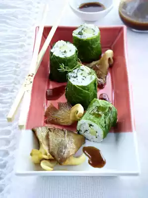 Wrap a bamboo mat in foil. Place salad leaves in 2 portions to form a rectangle (approx. 6 x 20 cm) on top. Spread rice in portions on the lettuce leaves with moistened hands (approx. 0.5 cm thick). Place cucumber strips in the middle of the rectangle. Roll up the leaves. Form the rolls with the bamboo mat