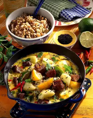 Wash the lamb filet, dab dry and cut into pieces. Carve the chilli lengthwise, remove the seeds. Wash and chop the chillies. Peel and finely chop the onion. Fry in a pan in hot oil.