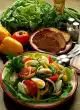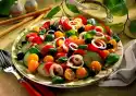 Pin with wooden skewers. Cover the pumpernickel slices with some salad. Arrange the rolls on top. Garnish with tomato and chives
