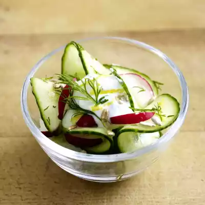 Clean the romaine lettuce, wash it. Cucumber wash, clean and cut or slice into thin slices. Wash chives, shake dry and cut into long rolls. Mix sour cream and milk, season to taste with salt, pepper and sugar.
