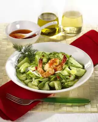 Fry the prawns for about 1 minute, turning them once. Mix cucumber slices, spring onion rings and chilli vinaigrette. Arrange the salad with 2 prawns per plate. Garnish with dill
