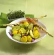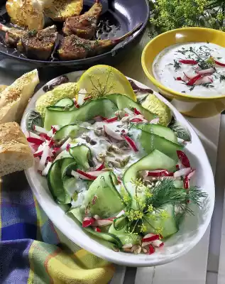 Season to taste with salt and pepper. Arrange cucumber and radishes on a large plate and pour the sauce over them. Drizzle with olive oil. Sprinkle with sunflower seeds and remaining dill. Serve garnished with dill flags, dill flowers and lemon wheels.