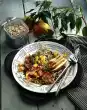 Wash the cucumber, dab dry and cut lengthwise into thin slices with a wide peeler. Clean the radishes, wash, drain and cut into sticks. Roast sunflower seeds in a pan without fat and remove.