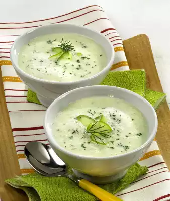 Season to taste with salt, pepper and nutmeg. Chill cucumber soup for at least 30 minutes. Cut the rest of the cucumber into thin slices. Wash the dill, dab dry and, except for a few dill flags for garnishing, chop finely and stir into the soup. Arrange soup in bowls and garnish with cucumber slices and dill