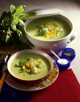 Cover and simmer for about 15 minutes, puree with a chopping stick. Add roux while stirring, bring to the boil again and refine with sour cream. Season soup with salt, pepper and a little herb vinegar.