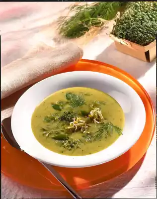 Cook the peppers in the soup for about 4 minutes. Heat up the cucumber cubes for about 2 minutes. Season to taste with salt and pepper. Sprinkle with the remaining herbs and sprouts. Serve soup warm or well chilled