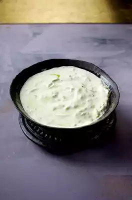 1⁄2 Peel the cucumber (approx. 200 g), halve lengthwise, remove seeds and grate coarsely. Mix 300 g crème fraîche, 2 tsp wasabi paste (tube) and 2-3 tbsp lemon juice. Fold in cucumber. Season to taste with salt and pepper.