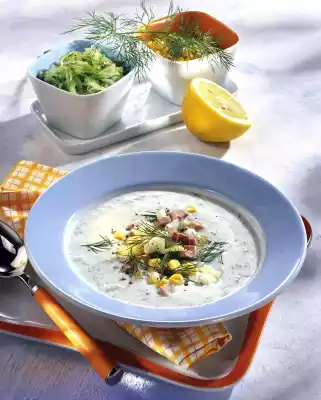 In the meantime, drain the corn. Peel and chop the onion. Cut the ham into cubes. Wash the dill, pluck the flags and chop finely. Mix yoghurt, dill and grated cucumber with the liquid that has been created. Season with pepper and lemon juice. Mix corn, onion and ham. Arrange yoghurt in portions with 1/4 of the corn mixture in plates