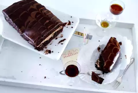 Carefully remove the cake from the tin and cut it in half horizontally. Carefully prick one half with a fork and sprinkle with coffee liqueur. Spread butter cream on top and place the second base on top, chill for about 15 minutes.