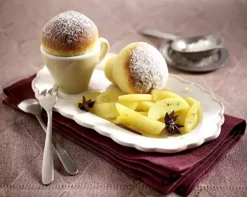 Cover and leave to rise again in a warm place for about 30 minutes. Form the dough into a long roll on a floured work surface with floured hands, cut into 12 equally sized pieces. Form pieces into dumplings and put them into 12 greased, ovenproof espresso cups. Cover the dumplings and let them rise again for 10-15 minutes. Melt 30 g butter. Brush the pastries with butter. Bake in the preheated oven (electric cooker: 175 °C/ convection oven: 150 °C/ gas: level 2) for 15-20 minutes, cover if necessary at the end. Cut lemon in half and squeeze. Peel apples, quarter them, remove seeds, cut them into slices and mix with lemon juice. Caramelise 80 g sugar in a pan. Sauté apple slices in it, add vanilla pulp, star anise and cinnamon, deglaze with white wine and simmer for about 5 minutes.