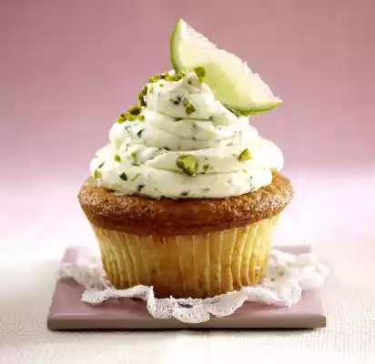 For the topping, briefly roast the pistachios in a pan without fat, remove. Wash lime hot, grate dry, grate peel thinly. Halve the fruit, squeeze juice from one half and cut the remaining half into 12 small slices. Chop the pistachios. Mascarpone, icing sugar, pistachio seeds, up to 5-6 teaspoons for sprinkling, mix lime peel and juice. Pour cream into a piping bag with a perforated spout and squirt onto the muffins as large tuffs. Sprinkle with remaining pistachios and decorate with lime wedges