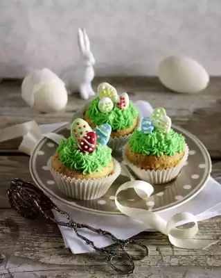 Colour 4 parts red, yellow, green and blue with some food colouring each. Pour the sugar icing into small paper piping bags or disposable piping bags. Spray flat, small eggs (approx. 36 pieces) onto a baking tray lined with baking paper, each with 1 colour. Decorate the eggs in colour. Bake in a preheated oven (electric cooker: 100 °C/ convection oven: 80 °C/ gas: not suitable) for 20-25 minutes. Remove the eggs and let them cool down. Mix 175-200 g icing sugar and cream cheese with the whisk of the hand mixer for 1-2 minutes. Colour green with food colouring and fill into a piping bag with a small star-shaped spout. Spray cream cheese mixture in small tuffs onto the muffins. Put them in a cold place until the surface gets a little firm. Remove the sugar eggs from the baking paper. Put into the muffins