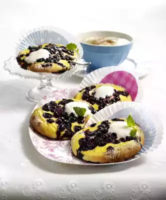 Spread evenly on the 12 flat cakes. Sprinkle blueberries over them. Bake the trays one after the other in a preheated oven (electric cooker: 175 °C/ convection oven: 150 °C/ gas: level 2) for 20-25 minutes. Remove, place on a grid and dust the edges with icing sugar. Decorate with lemon balm. Yoghurt tastes good with it